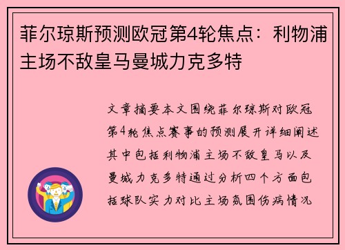 本文旨在对利物浦能否打破英超卫冕球队“魔咒式五连败”这一历史困境进行全景式深度解析。文章从球队竞技状态、战术演进逻辑、阵容健康度与心理链条、以及赛程与竞争环境四大角度展开,力求以多维度视角揭示利物浦在本赛季冲击魔咒时的关键走势与潜在变量。通过系统剖析球队在攻防结构、数据趋势、关键球员效能、对手强弱分布以及俱乐部管理层战略选择等因素,文章将展示利物浦究竟凭借什么具备打破诅咒的底气,又面临哪些现实中不...